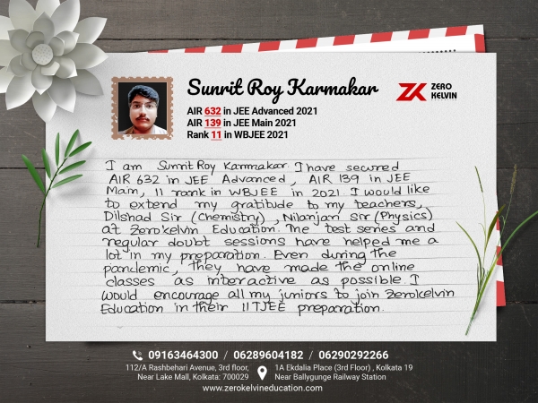 Rank : WBJEE RANK 3, JEE MAINS 131(West Bengal Topper), KVPY(SA) 145, JEE ADVANCED 484IIT DELHI